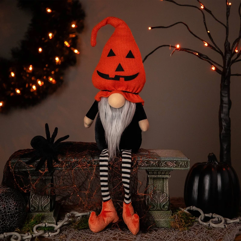 22" Halloween Jack-O-Lantern Striped Tabletop Gnome Figurine with Dangling Legs