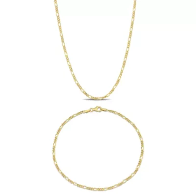 Enhance your everyday style with this versatile Figaro chain set, featuring a 2.2mm necklace and matching anklet crafted in yellow-plated sterling silver. The classic alternating link design catches the light beautifully, creating a subtle shimmer that complements any outfit. Perfect for layering together or wearing separately, this set blends timeless elegance with modern versatility, making it an essential addition to any jewelry collection. 2 Lobster closure Polished finish Warranty available, 60 days Italy Imported Product Specifications 16", 9" Material & Care Yellow Plated Sterling Silver Metal, Sterling silver Clean with a soft cloth.