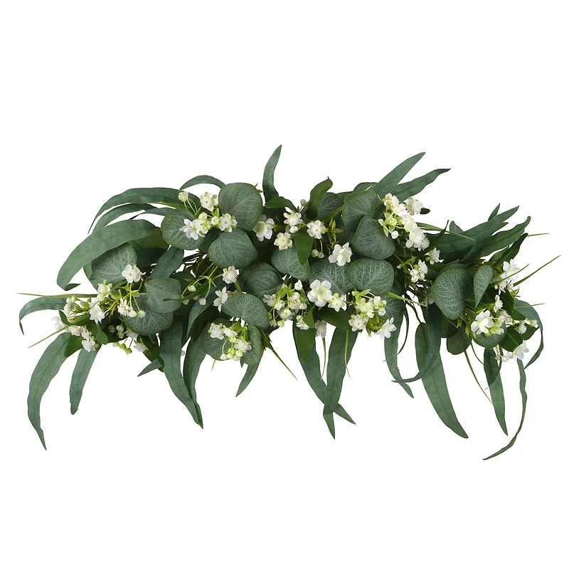 This fresh spring swag features white baby's breath and eucalyptus leaves throughout. You can use this occasion swag to decorate a table setting, drape over a mailbox or on top of a table with other décor pieces.Details:Green and white24" x 9" x 5" (60.9cm x 22.8cm x 12.7cm)Polyester, plastic and iron wireRecommended for indoor use only