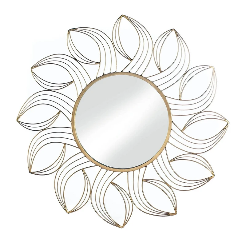 Make your space seem bigger and more beautifully decorated with this gorgeous mirror. Perfect as hallway embellishment, functional bathroom décor, or a statement living room piece, this mirror is both stunning and versatile. Centered in the middle of the golden petal flourishes is a gorgeous reflective mirror waiting to adorn your home. A great housewarming gift or personal home décor piece!Details:Golden petal frame25" x 25" x 1" frame size11" mirror diameterIron and glassFor indoor use
