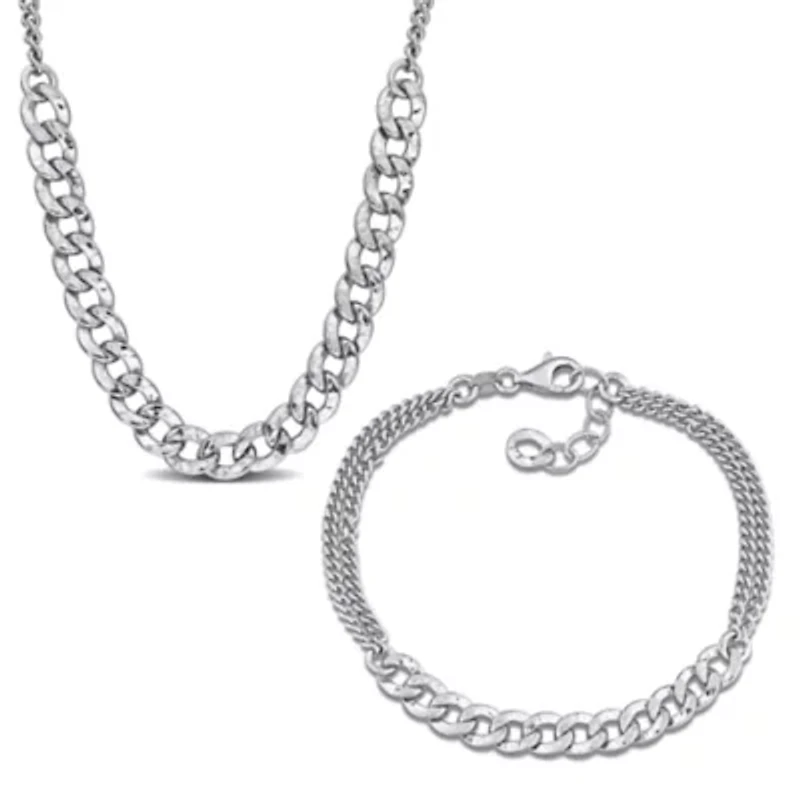 This coordinated set features a unique combination of classic curb links and textured hammered curb links, creating a bold and dimensional look. Crafted in sterling silver and available in both white and yellow plated finishes, the contrasting link styles add depth and visual interest while maintaining a polished, refined appearance. The necklace and bracelet are designed with adjustable extensions for a flexible and comfortable fit. Versatile and stylish, this set can be worn together for a cohesive statement or separately for effortless everyday elegance, making it a distinctive addition to any jewelry collection. 2 Lobster closure Polished finish Warranty available, 60 days Italy Imported Product Specifications 5 " + 1 ext. Material & Care Sterling Silver Metal, Sterling silver Clean with a soft cloth.