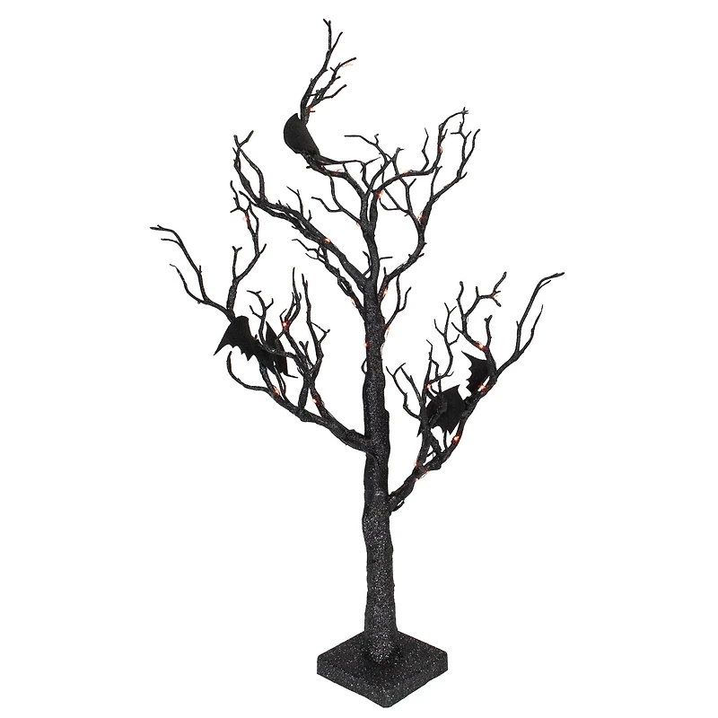 Don't limit your decorating to a space that requires an outlet. Use this black illuminated glitter tree to free yourself from the burden! With its bat-shaped accents, this tree would be perfect for your Halloween décor. Use it to decorate your mantel, table or office desk to add a spooky vibe. Details:Black with orange bulbs26.5" x 16" x 12" full dimensions40 micro fairy bulbsBulbs are non-replaceableOn/off switch located on the bottom of battery packDesigned on a square baseRequires 3 AAA batteries (not included)Plastic, felt, glitter and woodFor indoor use only