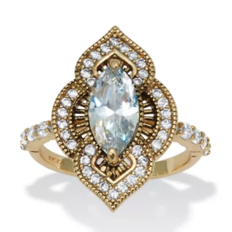Add a touch of vintage flair to any look with this stunning antiqued marquise ring. 2.67 carats T.W. of sparkling cubic zirconia stones accentuate its unique shape and intricate design. A show-stopping 14k yellow gold-plated piece for any occasion. Sizes 6-10.Main Stone: 1 Marquise Faceted Cut Cubic Zirconia, 2.00 carats, 12 mm x 6 mm; 10 Round Faceted Cut Cubic Zirconias, .33 carat total weight, 2 mm x 2 mm; 34 Round Faceted Cut Cubic Zirconias, .34 carat total weight, 1.3 mm x 1.3 mm14k Gold-PlatedShank Width: 2.0 mm wideDimensions: 23.5 mm wide x 23.5 mm long x 6.5 mm highIncludes gift box and drawstring pouch14k Gold-PlatedShank Width: 2.0 mm wideDimensions: 23.5 mm wide x 23.5 mm long x 6.5 mm highIncludes gift box and drawstring pouch 45 Polished finish Warranty available China Imported Product Specifications 1.18 in x 0.93 in x 0.93 in 2.67 Material & Care Metal, Gold plated Clean with a soft cloth.