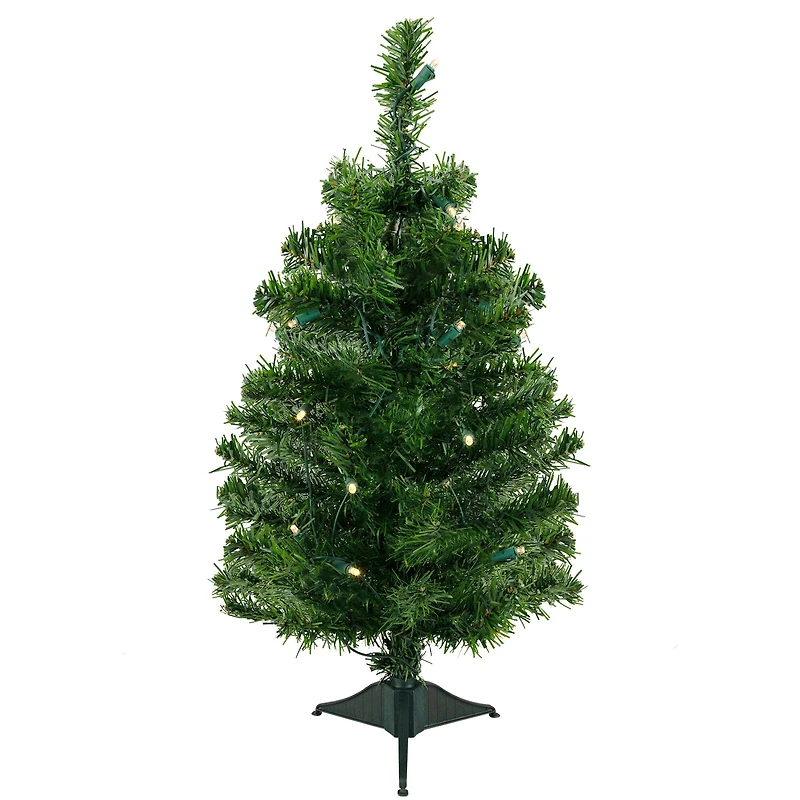 This stunning tree captures the timeless beauty of a traditional pine while offering the convenience of hassle-free setup and dazzling warm white LED lights. Ideal for compact spaces tabletops or as an eye-catching addition to any room. Say goodbye to tangled wires and endless hours spent stringing lights. Our mixed pine comes pre-decorated with energy-efficient LED lights evenly distributed throughout the branches. The warm glow of these lights casts a magical aura evoking feelings of joy and celebration. Tree Style: Medium mixed classic pine Green 70 tips PVC Dimensions: 2 ft. height 14" diameter 2" tip width Lighting Information: Warm white 25 concave wide-angle LED lightsDurable non-glass bulbsCool to the touch Long-lasting and use up to 90% less energy Comes with replacement bulb and spare fuse If one bulb burns out the rest will stay lit Lamp Lock feature which makes them replaceable, interchangeable and keep them from falling out UL certified Features: 2-piece easy assembly Includes green plastic stand Recommended for indoor use