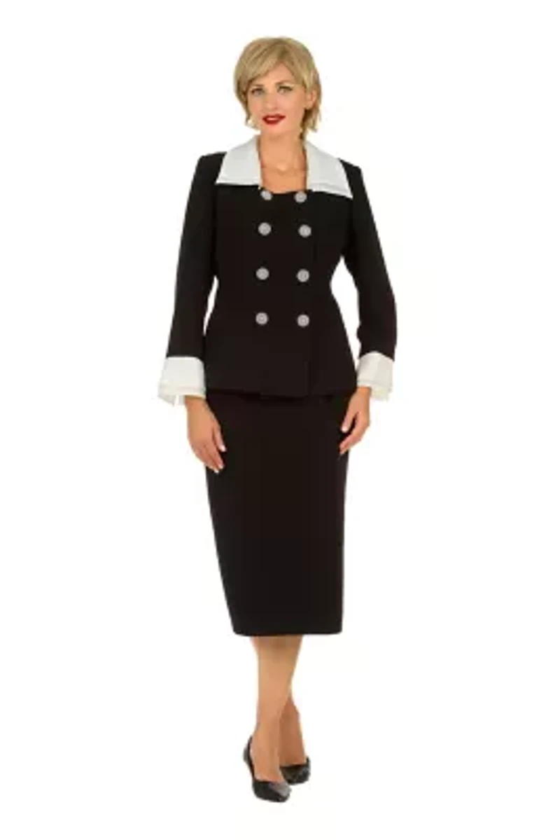 Refined 2-Piece Skirt Suit Set – A beautifully tailored jacket and pencil skirt combination designed to embody grace, confidence, and effortless polish. Chic Contrast Detailing – Striking ivory collar and cuff accents create a bold yet sophisticated contrast against the classic black silhouette. Statement Button Design – Adorned with elegant round decorative buttons that add a touch of refined glamour and visual interest. Flattering Tailored Fit – Structured jacket enhances the waistline while the sleek pencil skirt elongates the figure for a poised, feminine silhouette. Day-to-Evening Versatility – Perfect for church, special occasions, business events, and elegant gatherings. Timeless Color Palette – Classic black and white combination ensures enduring style season after season. Elegant & Confident Style – Designed for the modern woman who appreciates sophistication with a polished, graceful presence. 2 Button closure Long sleeve, Split sleeves Imported Product Specifications 25 Material & Care Polyester Dry clean only