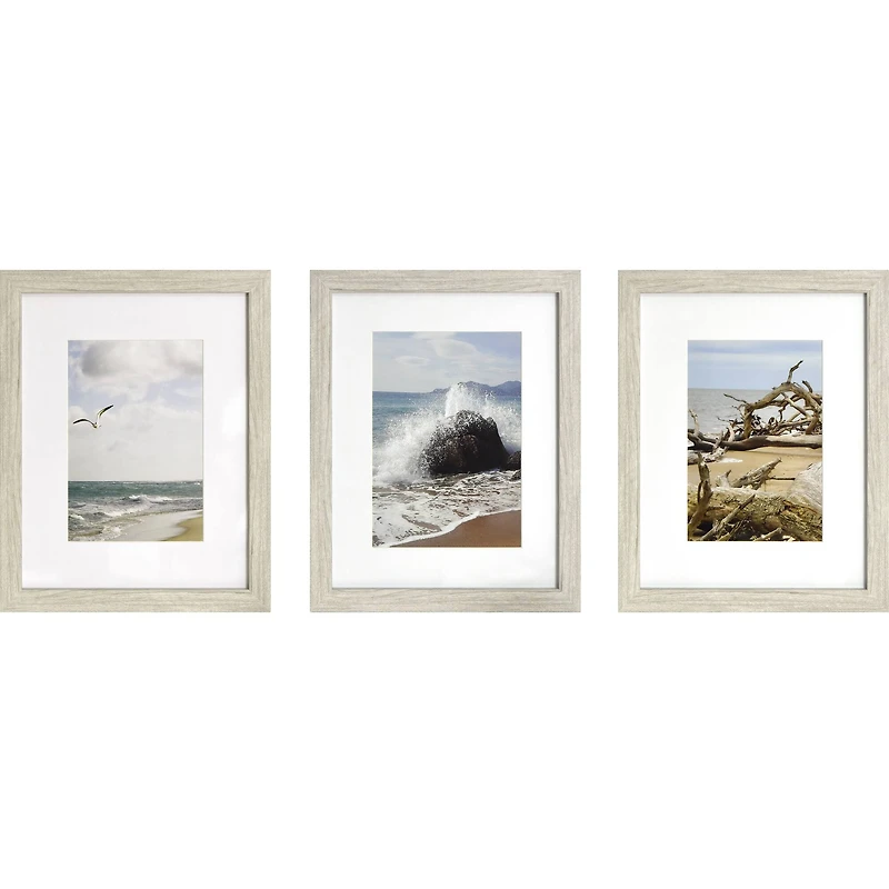 Personalize any wall into a gallery of your own with this classic frame set. This set has three graywash frames that can be hung horizontally or vertically to suit your photos, artwork, certificates and more.Details:Gray woodgrainAvailable in multiple sizesSet of 3Display horizontally or verticallyComplies to TSCA Title VIPlastic, glass and mat with MDF backingSize Information:5" x 7", 8" x 10" unmatted (12.7cm x 17.8cm, 20.3cm x 25.4cm unmatted)8" x 10", 11" x 14" unmatted (20.3cm x 25.4cm, 27.9cm x 35.5cm unmatted)
