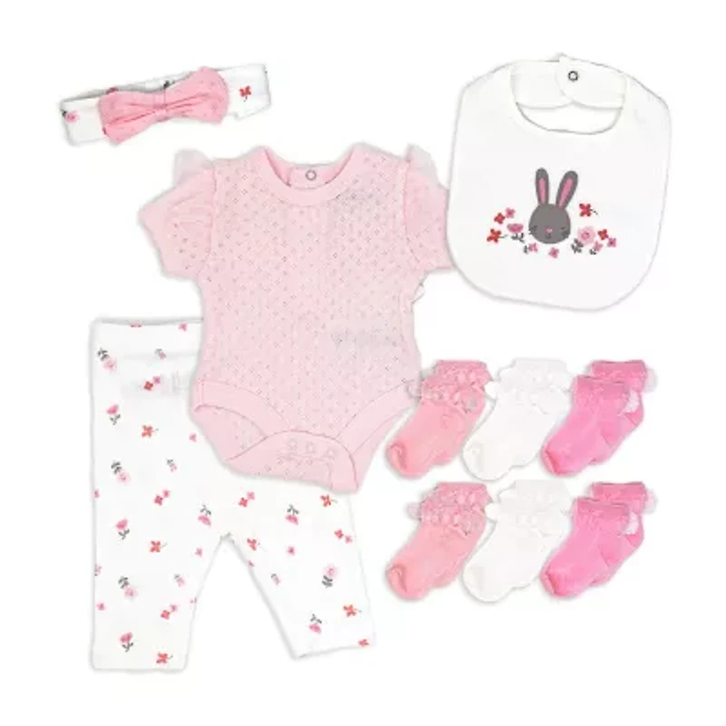 This adorable layette set for baby girl is as soft as it is precious. Set includes a short sleeve bodysuit, pull-on pants, 6 pairs of socks, bib and headband in soft pink with sweet bunny accents. Made from 100% cotton, this set is comfortable and breathable and fabric is a soft, airy weave for spring and summer. Bodysuit features 2 snap neck closure and 3 lower snaps for quick diaper changes and flutter tulle details at shoulders.Available in newborn, 0-3 months and 3-6 months sizes.