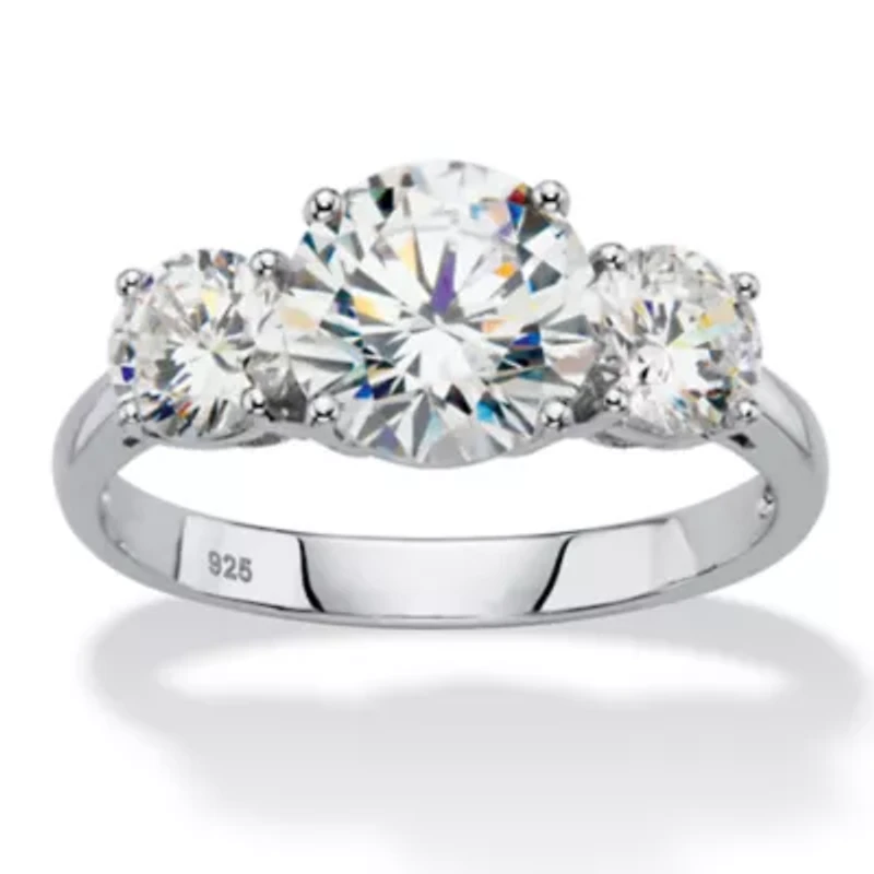 Set her heart afire with this sparkling symbol of your life together. This classic 3-stone ring will make your engagement or anniversary moment perfect. Set with 3 carats T.W. of faceted cubic zirconia rounds, you'll love the way this beauty lights up the room. Platinum-plated sterling silver. Sizes 6-10.Main Stone: 1 Round Radiant Cut Cubic Zirconia, 2.00 carats, 8 mm x 8 mmAccent Stone: 2 Cubic Zirconias 1.00 cttwPlatinum-Plated Sterling Silver; Contains 2.10 grams of Sterling SilverMeasures: 16 mm wide x 8 mm long x 5.5 mm high; Shank Width: 1.2 mm wideIncludes gift box and drawstring pouchPlatinum-Plated Sterling SilverContains 2.10 grams of Sterling SilverShank Width: 1.2 mm wideDimensions: 16 mm wide x 8 mm long x 5.5 mm highIncludes gift box and drawstring pouch 3 Polished finish Warranty available Thailand Imported Product Specifications 0.85 in x 0.31 in x 0.63 in 3 Material & Care Metal, Sterling silver Clean with a soft cloth.