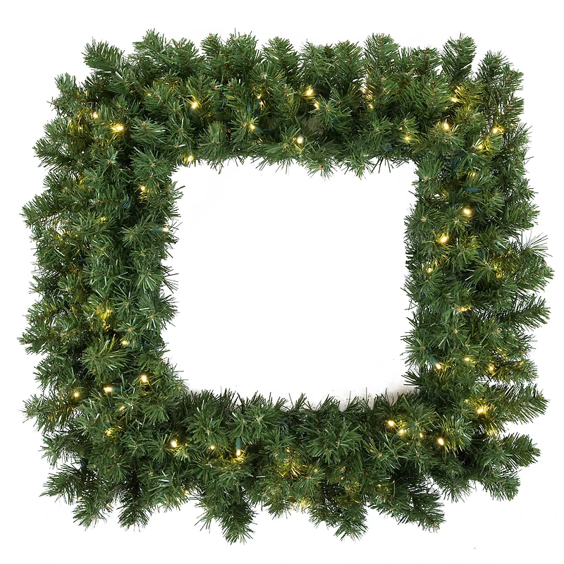 Add some holiday spirit to your front door or mantle with this beautiful wreath. This wreath features lush green tips and comes pre-lit with warm white single mold wide angle LED lights that run on 120V AC. It can be used just as it is or customized with your favorite ornaments, ribbons, or holiday picks.Details:Green with square design30" x 30" outer dimensions50 warm white single mold LED wide angle lights170 tips120V ACPVCRecommended for indoor and covered outdoor use