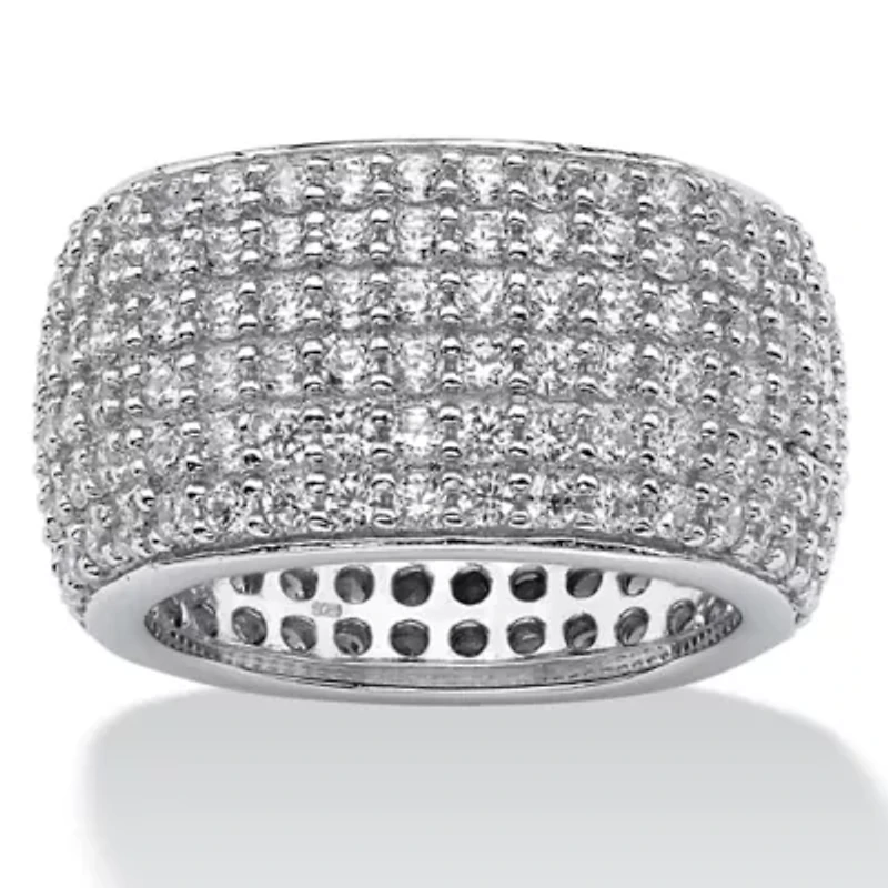 Modern eternity ring takes on multiple helpings of contemporary style with a multi-row of pavé-set cubic zirconia offering 3.00 carats T.W. of intense dazzle. A stunning indulgence designed in 1/2" width. Set in sterling silver. Sizes 6-10. We recommend that you order one size up for this style. (All carat weights are approximate and may vary slightly from those listed.)Main Stone: 200 Round Brilliant Cut Cubic Zirconias, 3.00 carats total weight, 1.5 mm x 1.5 mmSterling Silver; Contains 8.10 grams of Sterling SilverMeasures: 21 mm wide x 12 mm long x 3 mm high; Shank Width: 12.0 mm wideIncludes gift box and drawstring pouchSterling SilverContains 8.10 grams of Sterling SilverShank Width: 12.0 mm wideDimensions: 21 mm wide x 12 mm long x 3 mm highIncludes gift box and drawstring pouch 200 Polished finish Warranty available China Imported Product Specifications 0.94 in x 0.47 in x 0.83 in 3 Material & Care Metal, Sterling silver Clean with a soft cloth.