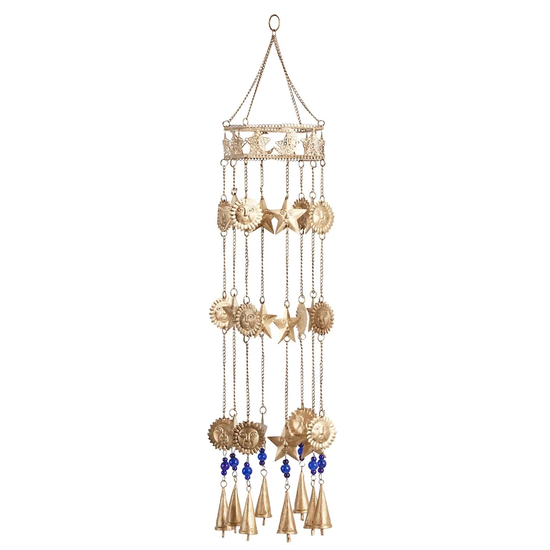 This gold-colored wind chime is a lively addition to any garden, porch, or patio. Suns and stars with detailed faces hang down from the crown. Near the bottom of the wind chimes, a collection of blue glass beads shimmer in the sunlight. And beneath the beads, bells dangle, waiting for a passing breeze to make them ring. On a windy day, this metallic wind chime will fill a space with melodic sound.Details:Gold5" x 5" x 32"Metal and glassEasily hang to nails or screws with its ring hookFor indoor and outdoor use