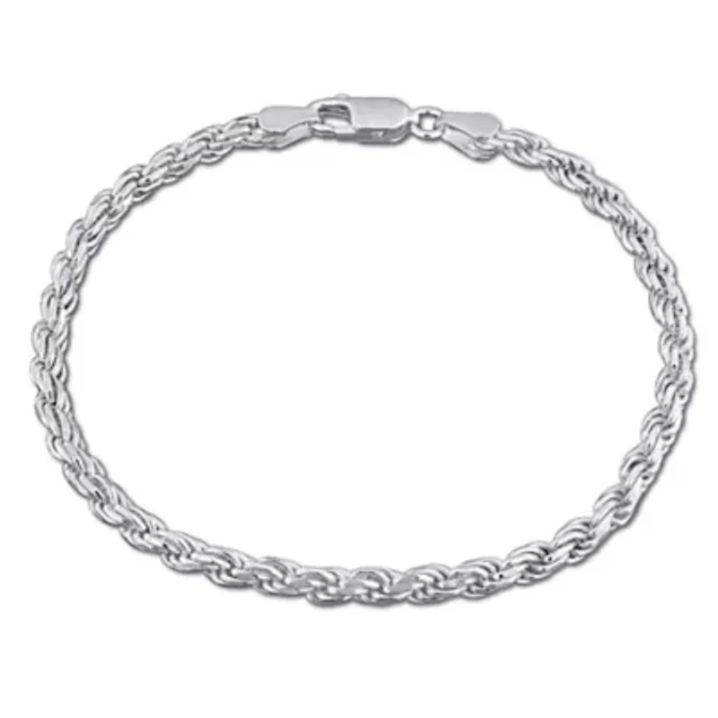Add a touch of refined elegance with this 3.1mm diamond-cut rope chain bracelet, crafted in sterling silver. Its intricate twisted design catches the light beautifully, creating a subtle shimmer that enhances any outfit, from casual daywear to evening ensembles. Perfect for layering with other bracelets or wearing alone as a statement of understated sophistication, this piece blends timeless charm with modern style, making it a versatile addition to any jewelry collection. Spring ring clasp Polished finish Warranty available, 60 days Italy Imported Product Specifications 7.25" Material & Care Sterling Silver Metal, Sterling silver Clean with a soft cloth.