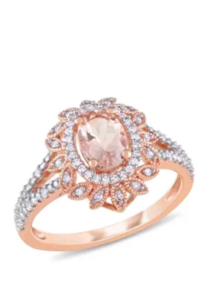 Fashioned in two-tone 10k rose gold, this vintage-inspired ring by Belk & Co. features an oval-cut morganite surrounded by pave-set diamonds. 1 morganite, 54 diamonds Color rating: H Clarity rating: I2-I3 Slip-on Pave and prong setting Polished finish 1 year warranty Imported Belk Exclusive Product Specifications 3/4 ct. t.w. morganite, 1/5 ct. t.w. diamonds 14.4 mm Width Material & Care 10k Rose Gold Clean with a soft cloth