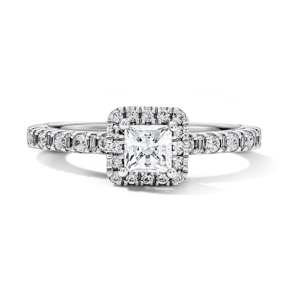 Choose a love that shines with this princess-cut lab-grown diamond frame ring in sterling silver. Sterling silver 3/8 ct. Princess-cut lab-grown diamond in a lab-grown diamond frame round and baguette-cut lab-grown diamonds line the shank. Certified lab-grown diamonds; f color/ vs2 clarity. Includes certification card 3/4 ct. T. W. Of lab-grown diamonds