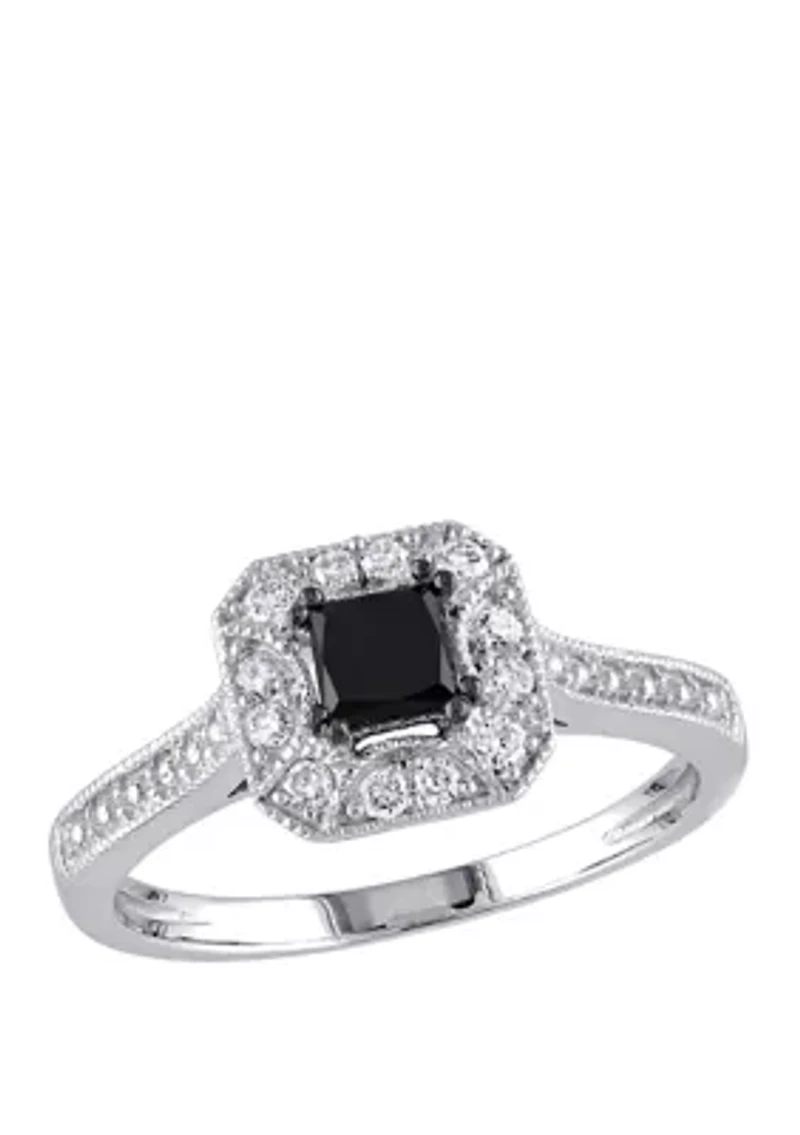 Crafted in lustrous 10K White Gold, this 3/5 ct. t.w. Black and White Diamond engagement ring from Belk & Co. will be treasured for a lifetime. The ring sparkles with a princess-cut, prong-set center Black Diamond, surrounded by twelve round, pave-set White Diamonds. A Diamond illusion details the slender band for added shimmer. 1 Black Diamond, 12 Diamonds Color rating: G, H Clarity rating: I2-I3 Slip-on Prong setting Polished finish 1-year warranty Imported Belk Exclusive Product Specifications 8.6 mm Width 3/5 ct. t.w. Black and White Diamond Material & Care 10K White Gold Clean with a soft cloth