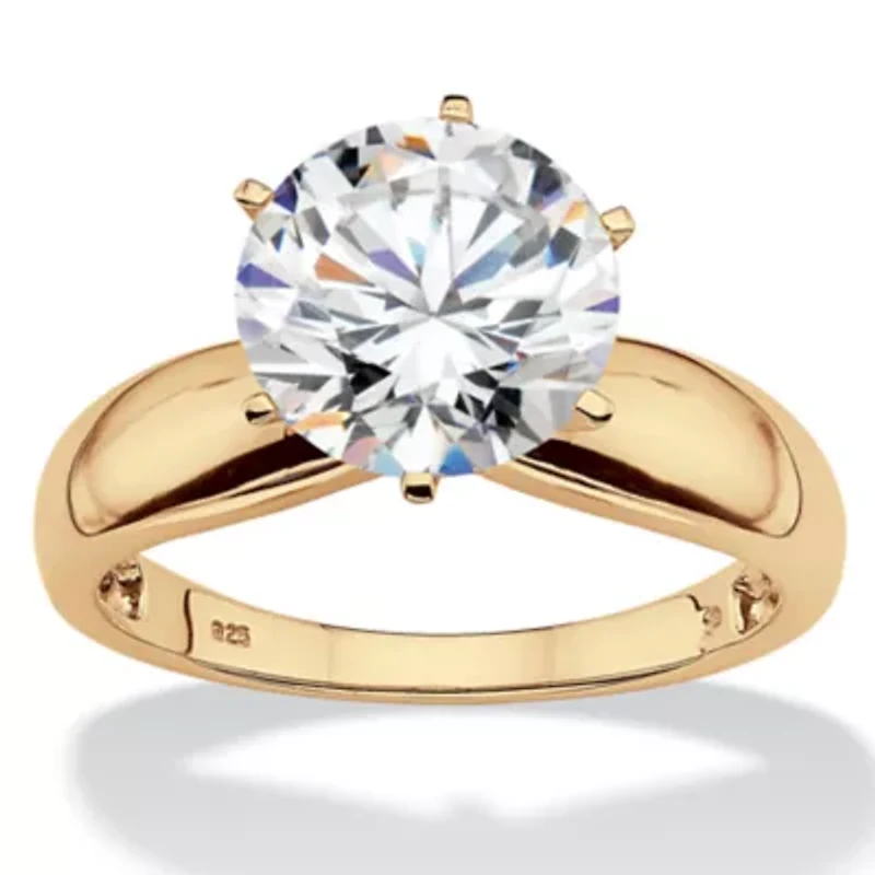 The simple, classic solitaire will never go out of style. This lovely cubic zirconia solitaire engagement ring boasts a 3.50 carat round stone that makes a dramatic entrance into any room. Set in 18k gold-plated sterling silver, you can't go wrong with this beauty. Sizes 5-10.Main Stone: 1 Round Faceted Cut Cubic Zirconia, 3.50 carats, 9.5 mm x 9.5 mm18k Gold-Plated Sterling Silver; Contains 2.60 grams of Sterling SilverMeasures: 5 mm wide x 20 mm long x 9.5 mm high; Shank Width: 4.5 mm wideIncludes gift box and drawstring pouch18k Gold-Plated Sterling SilverContains 2.60 grams of Sterling SilverShank Width: 4.5 mm wideDimensions: 5 mm wide x 20 mm long x 9.5 mm highIncludes gift box and drawstring pouch 1 Polished finish Warranty available China Imported Product Specifications 0.57 in x 0.79 in x 0.2 in 3.5 Material & Care Metal, Sterling silver Clean with a soft cloth.