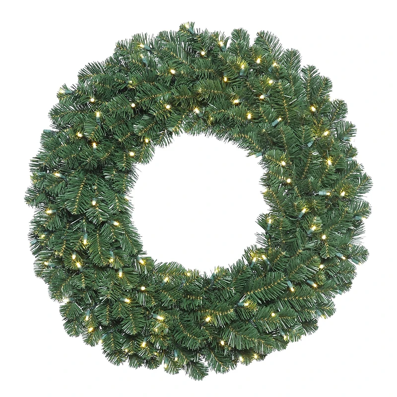 Add some holiday spirit to your double front doors with this beautiful green wreath. This unique wreath comes in halves and is pre-lit with warm white LED mini lights. It features traditional tips, giving a lush, full look, and can be customized with your favorite ornaments, ribbons, or holiday picks.