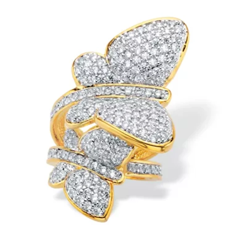 Catch these sparkling butterflies on your finger for a flash of whimsy and fashion bug glamour. The wings flutter with 3.60 carats of glittering pave cubic zirconia stones in this adjustable cocktail ring. Richly plated in 14k yellow gold for shining contrast. Sizes 6-12.180 Cubic Zirconias 3.60 cttw14k Gold-Plated, SilvertoneMeasures: 24.5 mm wide x 43 mm long x 15 mm high; Shank Width: 5.0 mm wideIncludes gift box and drawstring pouch14k Gold-Plated, SilvertoneShank Width: 5.0 mm wideDimensions: 24.5 mm wide x 43 mm long x 15 mm highIncludes gift box and drawstring pouch 180 Polished finish Warranty available China Imported Product Specifications 1.56 in x 1.69 in x 0.96 in 3.6 Material & Care Metal, Gold plated Clean with a soft cloth.