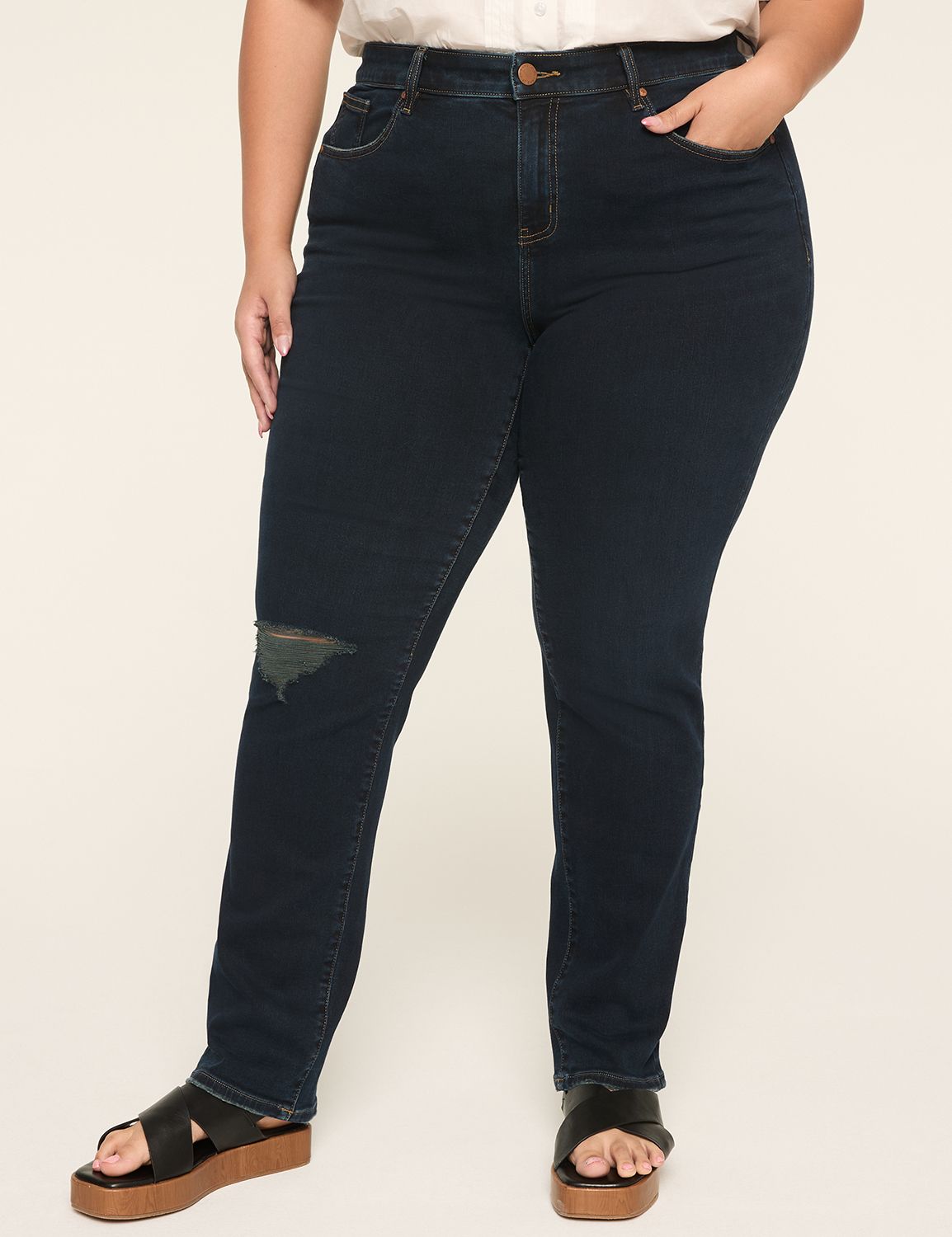 Available in Plus Size Now you can spend everyday wearing the softest jeans in the world. Introducing our NEW DreamFeel denim. Ultra-buttery, supernaturally soft denim in the made-for-you fits you love. FIT: Signature. Our most universally flattering fit, inspired by every body. Flex Magic Waistband. The no-gap, stretch waistband that moves with you for all-day comfort. Leg Shape: Straight. Slim fit from hip to knee with a flare from knee to hem. Inseam: Petite: 26", Short: 27", Regular: 29", Long: 32" Rise: High. Hits below natural waist. FEATURES: Belt loops Two front pockets, two back pockets Strategically placed back pockets for best-in-class booty lift Button and zip fly closure FABRIC: DreamFeel Denim. Ultra-buttery, out-of-this-world soft denim. Super Stretch. Perfectly comfy, perfectly stretches-with-your-every-move denim. Machine Wash 70% Cotton, 22% Lyocell, 6% Polyester, 2% Spandex WHY OUR DENIM IS THE BEST FOR CURVES: Co-created with you, your requests and feedback fuel our design! Magic behind the seams - best-in-class tech & solutions for the perfect fit, every single time. A variety of lengths, washes and stretch levels so every pair feels like it was made just for you. Item Number #412029 Imported Plus Size Denim ". Plus Size 360 Flex Signature Fit DreamFeel Straight Jeans, in Dark Denim, 22S, Women's, Lane Bryant