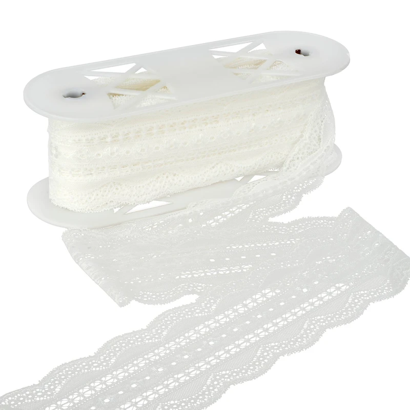 This lace trim from Celebrate It is perfect for adding to your next DIY project. The trim will add a refined classic touch to your craft. Use it to spruce up gift packaging or accentuate floral arrangements and more!Details:White3.7" wide15 yd. maximum cut lengthNon wired, crochetedPolyester