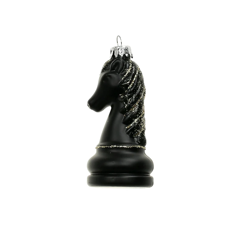 Bring whimsical charm to your home for the holidays with this glass novelty ornament from Ashland. Featuring a knight chess piece shape in black with glitter accents, this piece will be right at home hanging from your tree or mantel this Christmas season.Details:Black with glitter accents1.73" x 1.73" x 3.65" (4.4cm x 4.4cm x 9.3cm)Ready to hangGlass, PET, nylon and steelFor indoor use