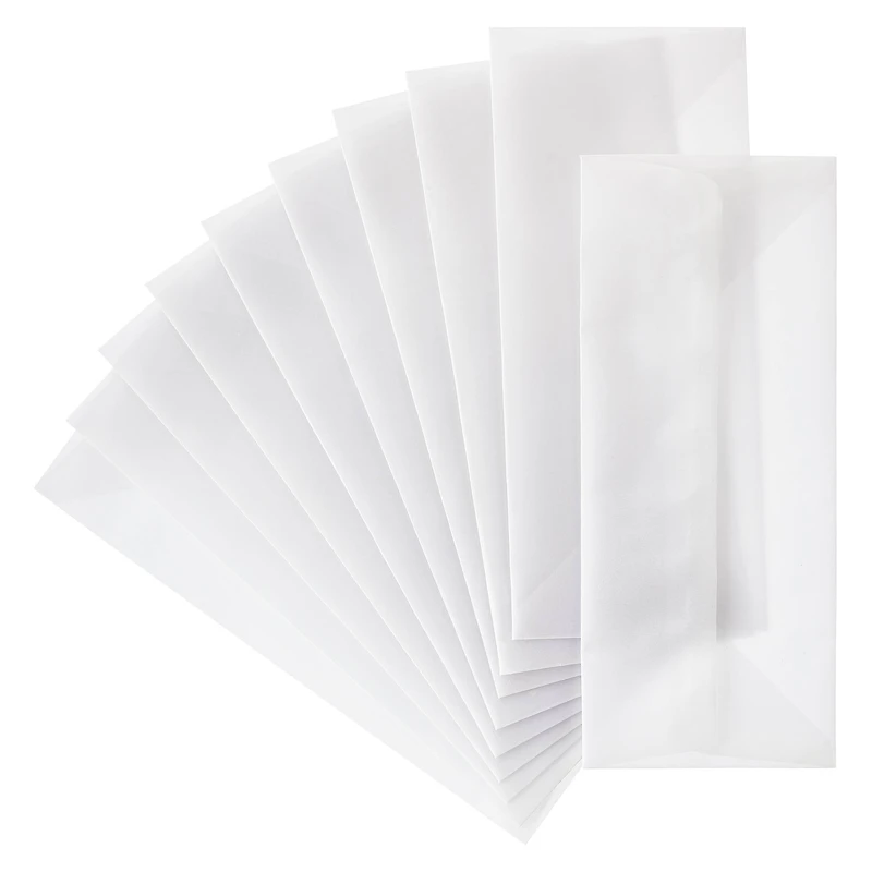 Enclose your formal correspondence and handmade cards in these classic vellum envelopes from Recollections. Featuring a fine translucent material and slimline design, these envelopes are ideal for handwritten letters or any stationary that calls for a lovely touch of simplicity. They can also be easily embellished to fit your theme using paints, markers, stickers and more!Details:WhiteFits 3.75" x 8.75" (9.5cm x 22.2cm) cards113 gsm10 envelopesSlimlineVellum