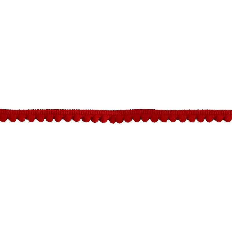 Add colorful texture to your projects with this pom pom trim. This soft pom pom trim is ideal to use as edging for pillows, apparel, costumes and other crafts.Details:Available in multiple colors3/8" (0.9 cm)15 yd. (13.7 m) maximum cut lengthNylon