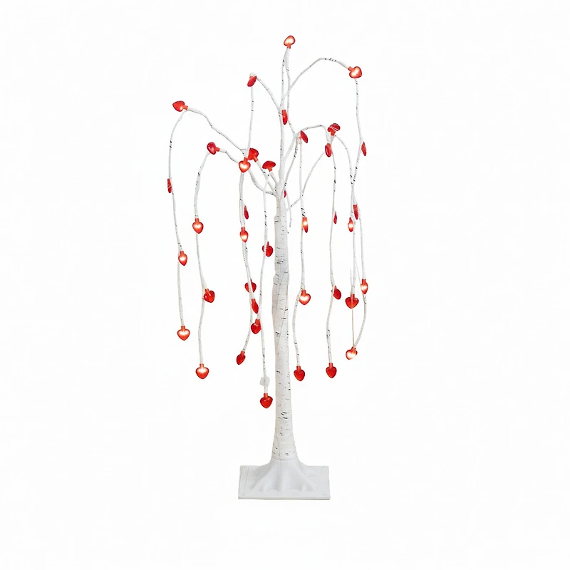 A romantic touch goes a long way in any space with this 3-ft pre-lit artificial willow tree adorned with light hued heart-shaped LED lights. Designed with willow-like branches that gracefully drape downward, it creates a gentle, glowing look. The white birch-style trunk offers a modern, elegant look that pairs with any décor style and great for spaces from cozy tabletops to romantic entryways. Plug it in and let the warm lights create a loving space. Fill your home with love and have some fun on Valentine's Day.Details: A romantic touch goes a long way in any space with this 3-ft Valentine's Day inspired twig treePre-lit with 40 draping heart shaped warm white energy-efficient LED lightsCrafted from premium materials, the heart-shaped LED lights will make you faux in love and bring cozy vibes anywhereBend and shape the branches for a custom look, stands in a sturdy white baseRecommended for decorative indoor use Product Dimensions: 3ft. H x 15in. W x 15in. D
