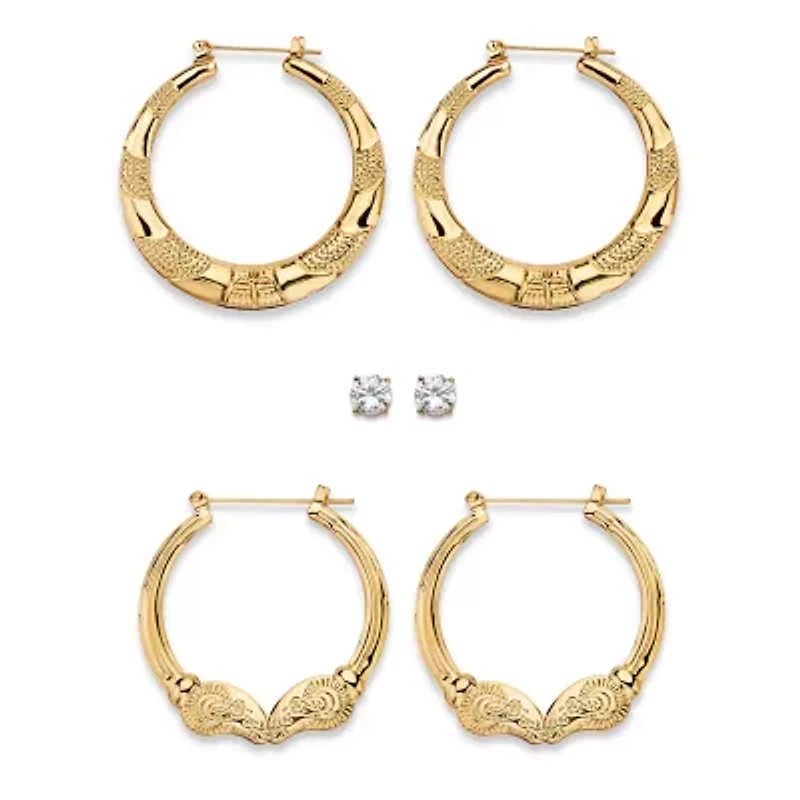 4 Cttw Cubic Zirconia Goldtone 3-Pair Set of Stud and Textured Hoop Earrings 2"