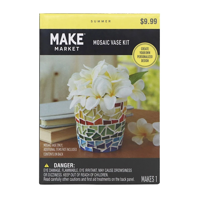 Make a mosaic vase with this kit from Make Market. This kit includes mosaic glass tiles for you to create your own personalized design. All you have to do is follow the instructions to arrange and glue mosaic pieces, and once it's set, apply grout and remove any excess grout to reveal the design. Details:RainbowMakes 1Glass, ceramic, grout, adhesive, sponge, plastic, and PVCContents:Ceramic vase (3.7" x 3.9"/9.4cm x 9.9cm)Grout (3.35 oz./95 g)Glue (0.68 fl. oz./20 mL)Mosaic glass tiles (3.7 oz./105 g)Mixing bowlStirrerSpongeGlovesTwineInstruction sheetDANGER: Eye damage, flammable, eye irritant, may cause drowsiness or dizziness. Keep out of reach of children. Read carefully other cautions and first aid treatments on the back panel.