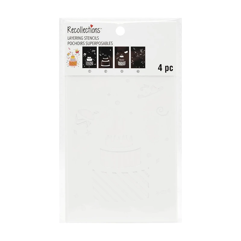 Add a lovely layered birthday cake print to your papercrafts with this stencil set from Recollections. Simply place the first stencil on your paper, secure with tape, apply your desired ink, then repeat for the other three stencils. Apply inks starting with the lightest shade to the darkest shade for outstanding results!Details:Birthday Cake print4" x 6" (10.1cm x 15.2cm) stencil sizeSet of 4 layering stencilsGently wipe stencils with soft or slightly damp cloth and let dry after each usePolypropylene