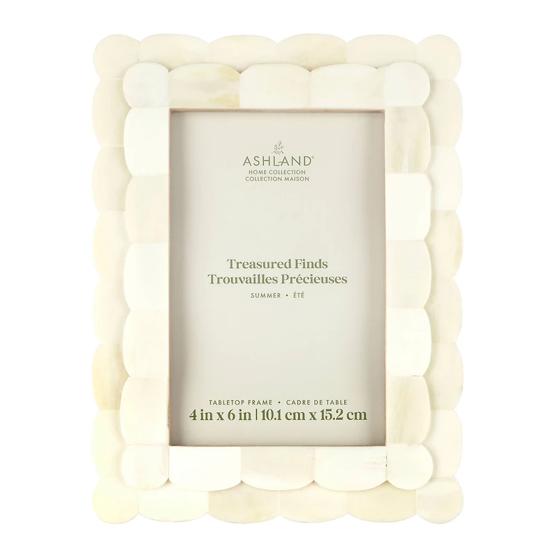 Add a natural touch to your decorations with this tabletop frame from Ashland. Crafted in bone with a scalloped edge, add your favorite photo and place on your mantel or end table to welcome springtime into your home.Details:Gold colored4" x 6" (10.1cm x 15.2cm) image size6.5" x 8.5" x 0.75" (16.5cm x 21.6cm x 2cm) overall sizeTreasured Finds collectionThick layer of glass protects imageFold-out easel and hanging hardware attachedComplies to TSCA Title VIBone, MDF, glass and metalFor indoor use