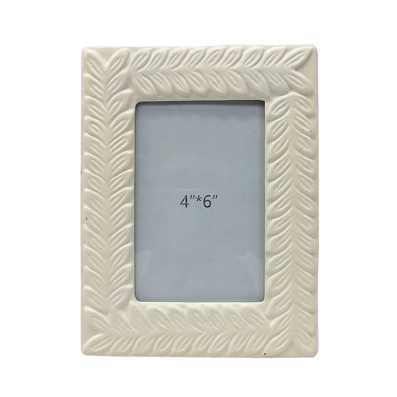 Add a natural feel to your decorations with this tabletop frame from Ashland. Crafted in resin with a leafy texture around the image, add your favorite photo and place on your mantel or end table to welcome the warmth of springtime into your home.Details:White4" x 6" (10.1cm x 15.2cm) image size6.7" x 8.67" x 0.5" (17cm x 22cm x 1.3cm) overall sizeTreasured Finds collectionThick layer of glass protects imageFold-out easel and hanging hardware attachedResin, stone powder, glass and paperboardFor indoor use