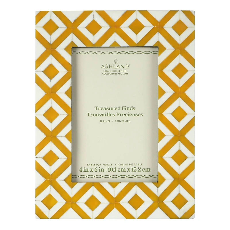 Add a natural touch to your decorations with this tabletop frame from Ashland. Crafted in resin with a yellow and white tile design, add your favorite photo and place on your mantel or end table to welcome springtime into your home.Details:Yellow and white4" x 6" (10.1cm x 15.2cm) image size6.5" x 8.5" x 0.75" (16.5cm x 21.6cm x 2cm) overall sizeTreasured Finds collectionThick layer of glass protects imageFold-out easel and hanging hardware attachedComplies to TSCA Title VIResin, MDF, glass and metalFor indoor use