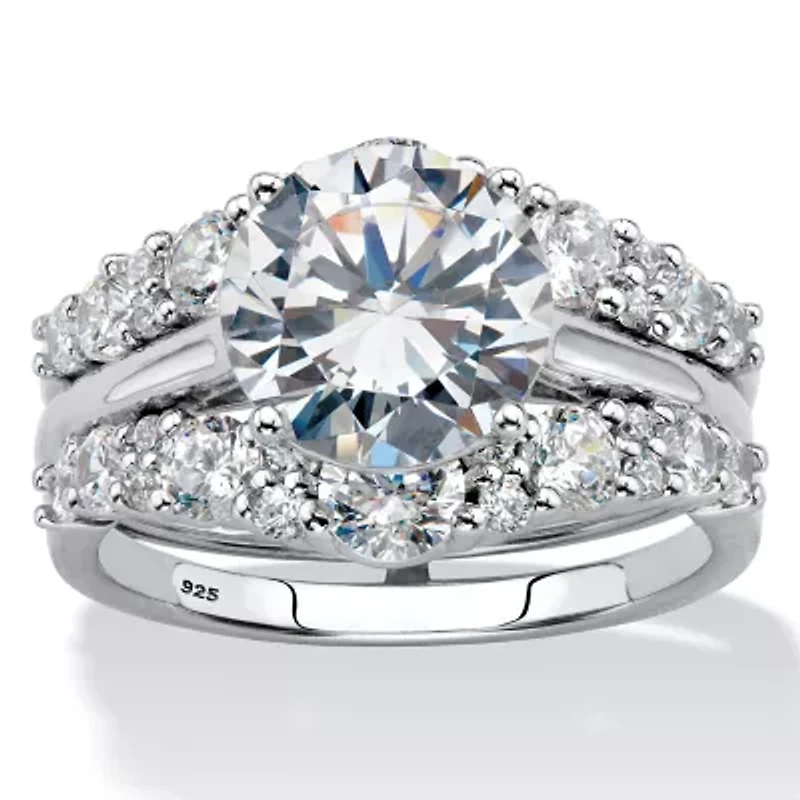 Sparkling like the crown jewels, this 2-piece wedding ring set will steal the show on your special day. A round cubic zirconia solitaire rests beautifully in a jacket shimmering with rounds. Crafted in platinum-plated sterling silver. 4.40 carats T.W. Sizes 6-10.Main Stone: 1 Round Radiant Cut Cubic Zirconia, 3.00 carats, 9 mm x 9 mmAccent Stone: 30 Cubic Zirconias 1.40 cttwPlatinum-Plated Sterling Silver; Contains 5.70 grams of Sterling SilverRing: 9 mm wide x 9 mm long x 8 mm high; Shank Width: 7.5 mm wide; 19.5 mm wide x 12 mm long x 3 mm highIncludes gift box and drawstring pouch16 Round Faceted Cut Cubic Zirconias, .13 carat total weight, 1.2 mm x 1.2 mmPlatinum-Plated Sterling SilverContains 5.70 grams of Sterling SilverShank Width: 7.5 mm wideRing Dimensions: 9 mm wide x 9 mm long x 8 mm high, Ring Dimensions: 19.5 mm wide x 12 mm long x 3 mm highIncludes gift box and drawstring pouch 2 31 Polished finish Warranty available China Imported Product Specifications 0.67 in x 0.35 in x 0.35 in 4.4 Material & Care Metal, Sterling silver Clean with a soft cloth.