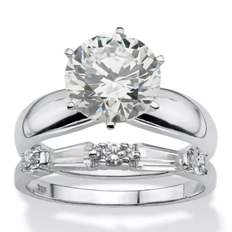 A forever treasure, this 2-piece wedding ring set gleams with timeless elegance. The solitaire ring is classically styled with a sparkling round cubic zirconia set in platinum-plated sterling silver. Charmingly simple, the sterling silver band shines with baguettes and round cubic zirconia. 4.48 carats T.W. Sizes 5-10. Main Stone: 1 Round Faceted Cut Cubic Zirconia, 3.50 carats, 9.5 mm x 9.5 mmAccent Stone: 2 Cubic Zirconias .68 cttwPlatinum-Plated Sterling Silver; Contains 4.00 grams of Sterling SilverRing: 5 mm wide x 20 mm long x 9.5 mm high; Shank Width: 6.5 mm wide; 18 mm wide x 3 mm long x 2.5 mm highIncludes gift box and drawstring pouchPlatinum-Plated Sterling SilverContains 4.00 grams of Sterling SilverShank Width: 6.5 mm wideRing Dimensions: 5 mm wide x 20 mm long x 9.5 mm high, Ring Dimensions: 18 mm wide x 3 mm long x 2.5 mm highIncludes gift box and drawstring pouch 2 6 Polished finish Warranty available China Imported Product Specifications 0.57 in x 0.79 in x 0.2 in 4.48 Material & Care Metal, Sterling silver Clean with a soft cloth.