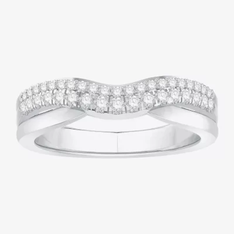 This wedding band from the Fine Jewelry collection has a timeless yet modern aesthetic you'll treasure forever. Available in 10K or 14K White or Yellow Gold, this sculpted curved band comes encrusted with round-cut natural diamonds in two rows for a sophisticated sparkling finish.