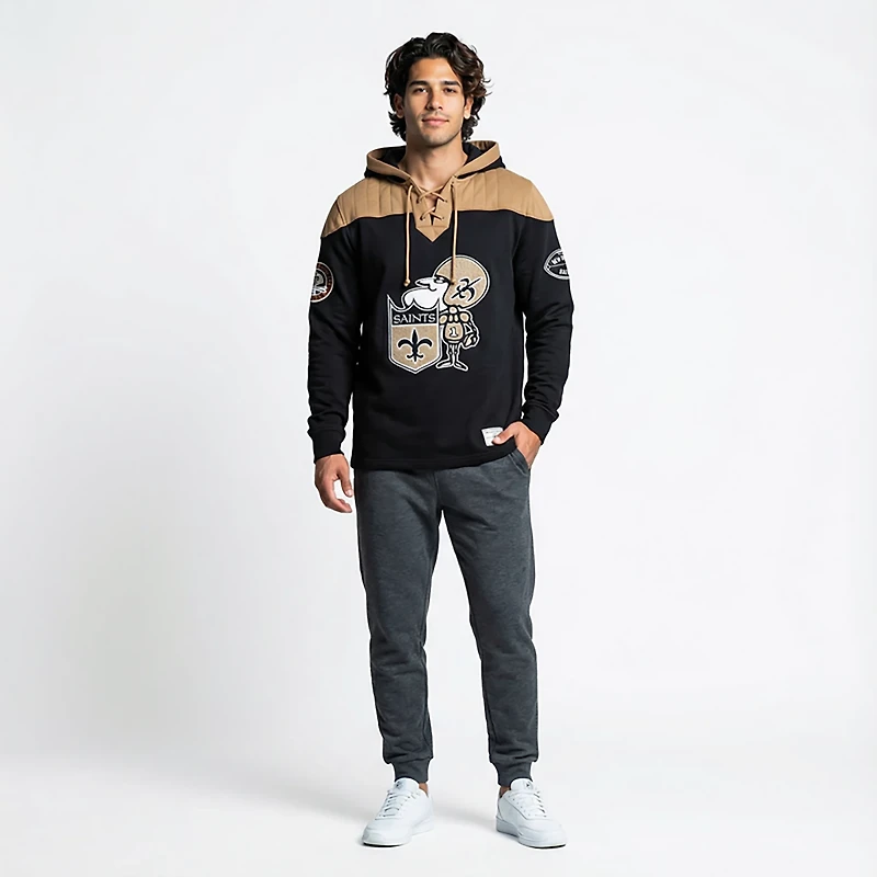 - Twill appliques of the New Orleans Saints on the body, shoulders, and sleeves