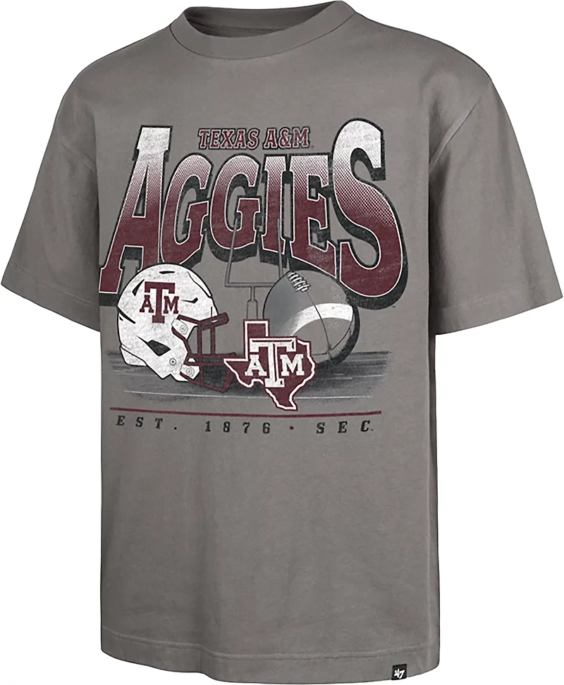 Root for your favorite team when you wear the '47 Men's Texas A&M Aggies Foundation Short Sleeve T-shirt. It is made of 100% cotton. The short sleeves keep you cool, and its drop shoulders create a roomy wear. The screen printed Texas A&M Aggies graphics on the front and back show off your team spirit.