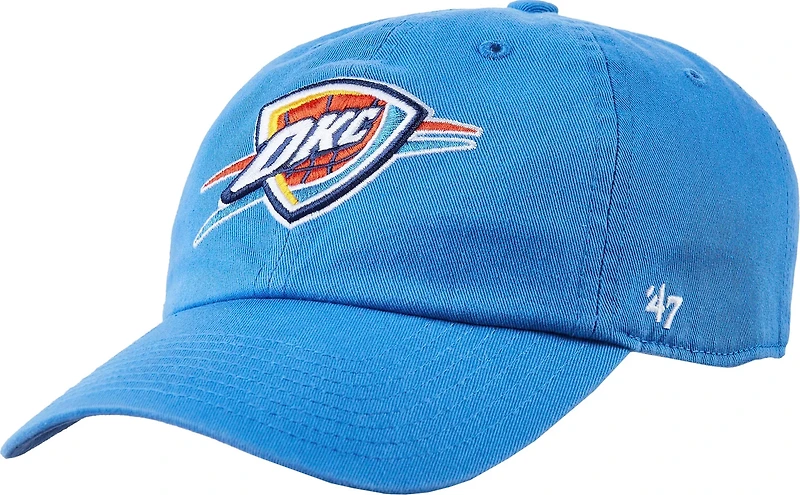 Show off your team pride with the '47 Oklahoma City Thunder Adults' Clean Up Hat. The adjustable strapback provides a snug fit, while the curved and relaxed design offers a comfortable wear. The Thunder logo embroidered on the front and loop label on the back displays your team spirit. Grab this hat and more NBA gear at Academy.com.