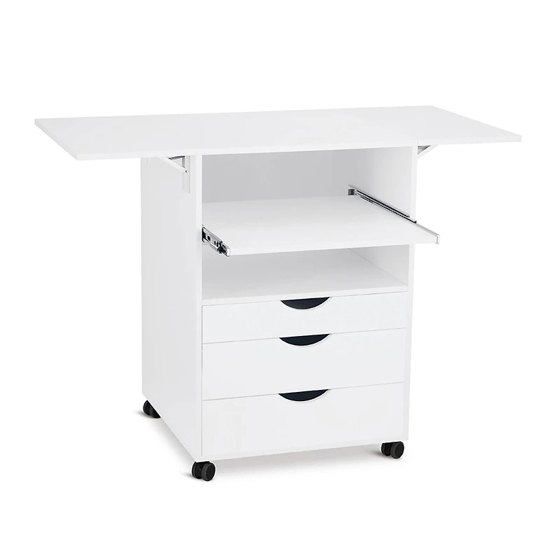 This mobile workstation cart is the perfect all-in-one storage and work space for your home or classroom. It features three drawers, a fixed shelf and a pull-out tray for organizing your craft supplies. This workstation features hinged sides to expand your top work surface while in use. Lift the top work surface when needed and the expanded sides will stay in place. After completing your project you can fold the expanded sides to conserve storage space.Click here for assembly instructions.Click here for furniture strap instructions.Details: White Hardware included Adult assembly required Place heaviest items in the lowest drawers or shelves Laminated particle board and ironSize Information: 48" x 24" x 36" (121.9cm x 60.9cm x 91.4cm) expanded size with wheels 48" x 24" x 33.5" (121.9cm x 60.9cm x 85cm) expanded size without wheels 25" x 24" x 36" (63.5cm x 60.9cm x 91.4cm) collapsed size 23.5" x 18.3" x 4" (59.6cm x 46.4cm x 10.1cm) small drawer size 23.5" x 18.3" x 5.9" (59.6cm x 46.4cm x 14.9cm) large drawer size 10 lb. (4.5 kg) maximum weight for shelf 22 lb. (10 kg) maximum weight for pull out tray 22 lb. (10 kg) maximum weight for hinged sides 44 lb. (20 kg) maximum weight for each drawer 66 lb. (29.9 kg) maximum weight for top shelf 220 lb. (100 kg) maximum weight totalFeatures: 4 wheels (2 locking) 3 drawers Expandable workstation Hinged sides expand your work surface Top work surface lifts up Pull out tray Permanent shelfCare & Usage: Dust with a clean, dry, soft, lint free cloth Blot spills immediately and wipe dry We do not recommend the use of chemical cleaners, abrasives, or furniture polish on white painted items