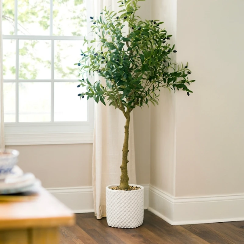 Bring the natural beauty of the Mediterranean into your home with our 5 ft Olive Tree in White Pot. This artificial tree features lush leaves, black olives, faux rock filling, and a realistic trunk, gorgeously replicating the real tree without any of the upkeep. Style it in a bedroom, living room, or reading nook for an effortless refresh. Tree measures 5.25ft. in height (63 in.) with a 22 in. in diameter Crafted of 35% polyester, 10% plastic, 10% iron wire, 10% polyfoam, 10% rock, 25% resin Artificial olive tree design Housed in a white textured pot Faux rock filling Hues of green, black, and white Comes ready for display Care: Dust with a soft, dry cloth. Contact your local Kirkland's store for availability. Quantities and selection may vary by location.
