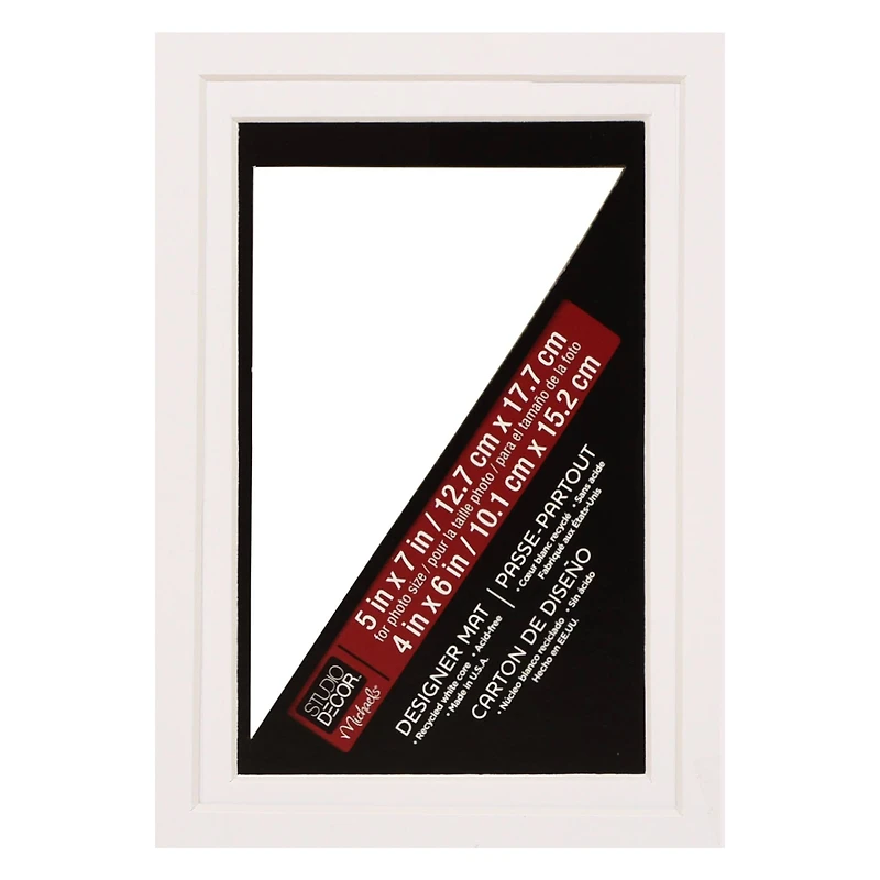 Lend your photo frame an elegant vibe with this designer mat by Studio Décor. This pre-cut mat will pair well with a contemporary black or gold colored frame. Just add a candid picture to the frame for a charming finish.Details:White4" x 6" openingFits 5" x 7" frameRecycled white coreAcid free