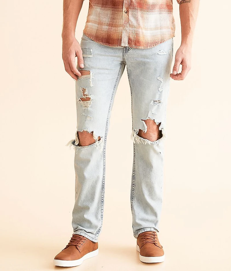 Slim fit jean Mid-rise, 14 1/2" bottom opening Hand sanding, grinding, destruction with fill yarn details Zip fly