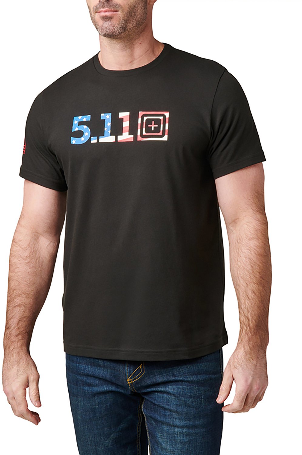 Feel confident in the 5.11 Tactical Men's USA Flag Fill Short Sleeve Shirt. The 60% cotton and 40% polyester jersey construction offers a soft feel all day, and the double-needle stitching on hems and sleeves provide additional strength. The sleeve design adds a fashionable touch, and the premium ink lasts through the long days.