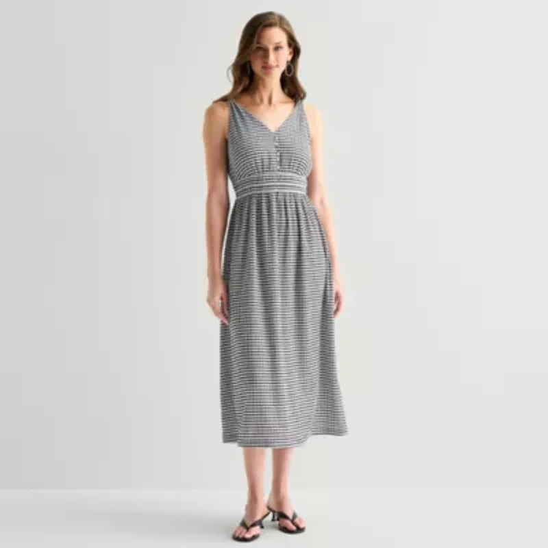 Gingham is a chic staple for summery get-togethers, so add this 52seven women's sleeveless dress to your rotation. Made from a woven blend, this midi dress has a v-neck, a banded waist and a full pleated skirt. Wear it with flat or heeled sandals.