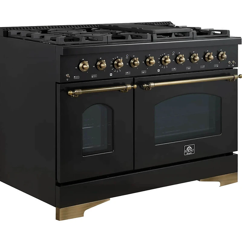 Upgrade your kitchen with FORNO's 48" white Dual Fuel Range. It features 8 sealed burners with a total of 94,000 BTU, including two dual-ring brass burners for precise control. The 3.5 cu.ft. convection oven and 2 cu.ft. oven offer plenty of space for large meals. The antique brass accents add a touch of sophistication, and the sturdy cast-iron grates and recessed enamel cooktop make for easy cleanup. This range comes with a 2-year warranty from FORNO.