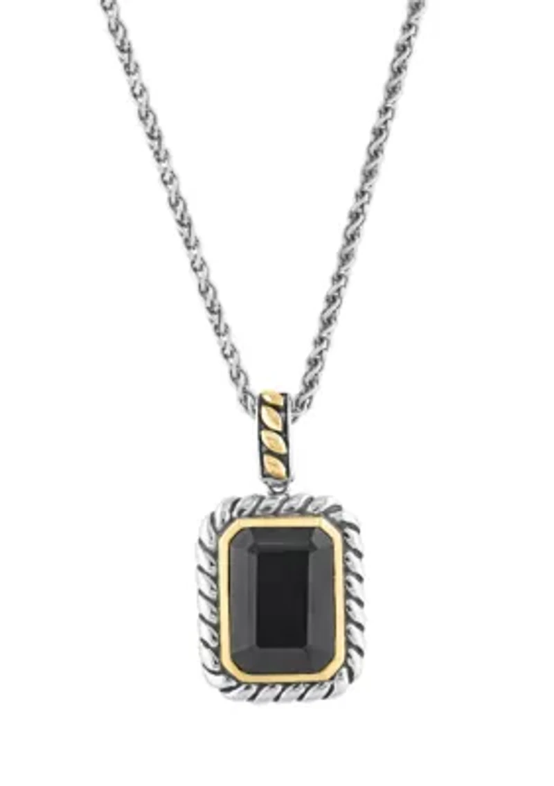 Indulge in the timeless elegance of this silver pendant necklace from Effy®. Its polished finish and emerald-cut onyx gemstone exude sophistication. The secure lobster closure ensures a comfortable fit, making it perfect for any occasion. Elevate your style with this captivating piece that will become a cherished keepsake. 1 Onyx Lobster closure Polished finish Prong setting Lifetime limited liability warranty available Imported Product Specifications 18" L 5.7 ct. t.w. Onyx Material & Care Sterling silver, 18K Yellow Gold Clean with a soft cloth