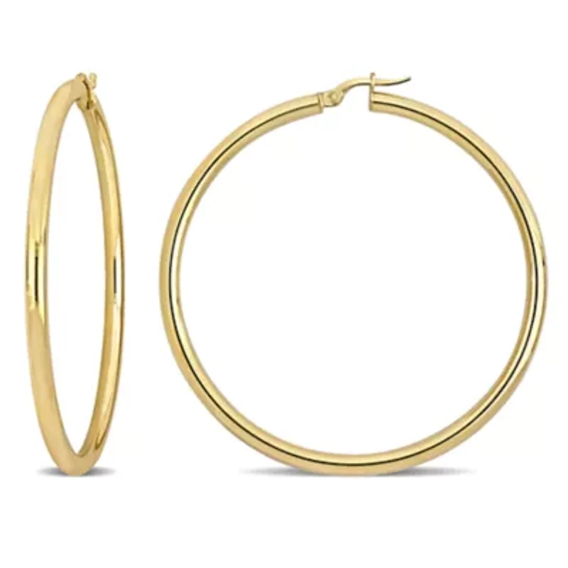 Make a statement with these 57.5 mm hoop earrings in 14K yellow gold, featuring a sleek 3 mm width for a bold yet refined look. The polished finish catches the light beautifully, while the hinge snap closures provide secure, comfortable wear. Perfect for elevating everyday outfits or adding a striking accent to special occasions, these hoops blend timeless elegance with contemporary style, creating a versatile, eye-catching accessory. 2 Click top closure, Jewelry clasp Polished finish Warranty available, 60 days Italy Imported Product Specifications 3-mm width Material & Care 14K Yellow Gold Metal, Yellow Gold Clean with a soft cloth.