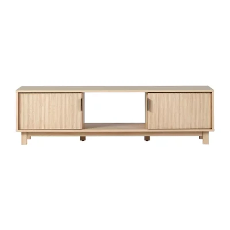 Whether you're into art-deco design, japandi interiors, or a modern motif, this is the tv stand you've been looking for. With its sleek and subtle hardware, reeded double doors, and fuss-free open storage cubby, your tech will be perfectly perched in style. Its low-profile leaves room for you to display your wall-mounted tv, decor, or wall art, yet it offers enough open and closed storage for all your entertainment center essentials. A warp resistant MDF wood build and stunning yet durable laminate finish lends form, function, and a fashionable aesthetic.